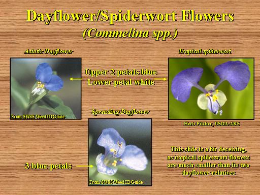 Dayflower/Spiderwort Flowers (Commelina spp.)<BR>Asiatic Dayflower<BR>Spreading Dayflower<BR>Tropical spiderwort<BR>From SWSS Weed ID Guide<BR>From SWSS Weed ID Guide<BR>This slide is a bit deceiving, <BR>as tropical spiderwort flowers <BR>are much smaller than its two <BR>dayflower relatives<BR>Herb Pilcher, USDA-ARS<BR>3 blue petals<BR>Upper 2 petals blue <BR>Lower petal white<BR>