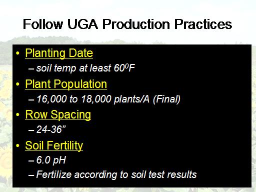 Follow UGA Production Practices<BR>Planting Date <BR>soil temp at least 600F <BR>Plant Population <BR>16,000 to 18,000 plants/A (Final) <BR>Row Spacing <BR>24-36” <BR>Soil Fertility <BR>6.0 pH <BR>Fertilize according to soil test results <BR>