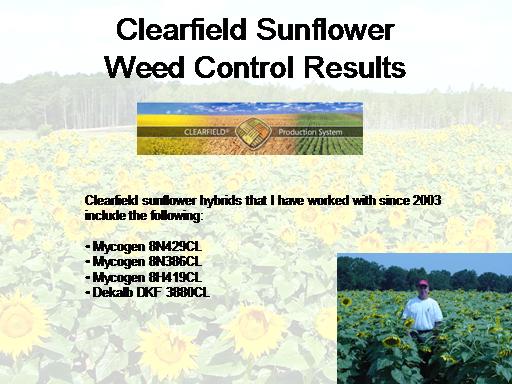 Clearfield Sunflower  Weed Control Results<BR>Clearfield sunflower hybrids that I have worked with since 2003 <BR>include the following: <BR> <BR> Mycogen 8N429CL <BR> Mycogen 8N386CL <BR> Mycogen 8H419CL <BR> Dekalb DKF 3880CL<BR>