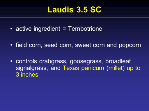 Laudis 3.5 SC<BR>active ingredient = Tembotrione <BR> <BR>field corn, seed corn, sweet corn and popcorn <BR> <BR>controls crabgrass, goosegrass, broadleaf signalgrass, and Texas panicum (millet) up to 3 inches <BR>