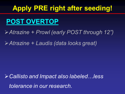 Apply PRE right after seeding!<BR>Atrazine + Prowl (early POST through 12”) <BR>Atrazine + Laudis (data looks great) <BR> <BR> <BR>Callisto and Impact also labeled…less tolerance in our research.<BR>POST OVERTOP <BR>