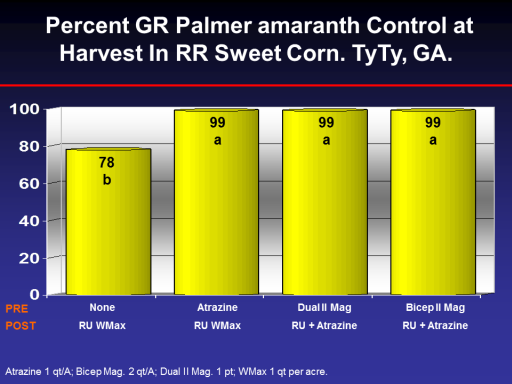 Percent GR Palmer amaranth Control at Harvest In RR Sweet Corn. TyTy, GA. <BR>78 b<BR>99 a<BR>99 a<BR>99 a<BR>Atrazine <BR>RU WMax<BR>Dual II Mag <BR>RU + Atrazine<BR>None <BR>RU WMax<BR>Bicep II Mag <BR>RU + Atrazine<BR>PRE<BR>POST<BR>Atrazine 1 qt/A; Bicep Mag. 2 qt/A; Dual II Mag. 1 pt; WMax 1 qt per acre.<BR>