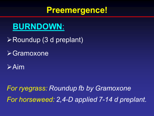 Preemergence!<BR>Roundup (3 d preplant) <BR>Gramoxone <BR>Aim <BR> <BR>For ryegrass: Roundup fb by Gramoxone <BR>For horseweed: 2,4-D applied 7-14 d preplant.<BR>BURNDOWN: <BR>