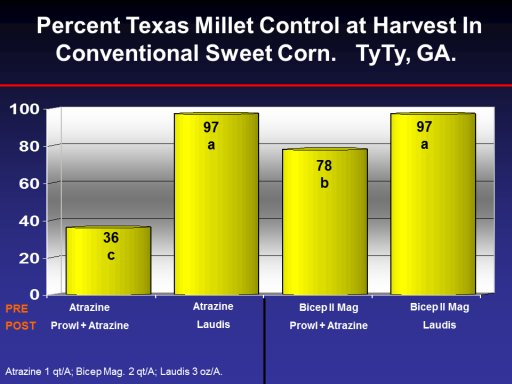 Percent Texas Millet Control at Harvest In Conventional Sweet Corn.   TyTy, GA. <BR>36 c<BR>78 b<BR>97 a<BR>97 a<BR>Atrazine <BR>Prowl + Atrazine<BR>Bicep II Mag <BR>Prowl + Atrazine<BR>Atrazine <BR>Laudis<BR>Bicep II Mag <BR>Laudis<BR>PRE<BR>POST<BR>Atrazine 1 qt/A; Bicep Mag. 2 qt/A; Laudis 3 oz/A.<BR>