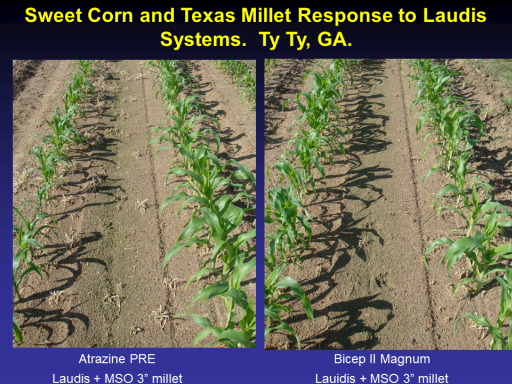Sweet Corn and Texas Millet Response to Laudis Systems.  Ty Ty, GA. <BR>Atrazine PRE <BR>Laudis + MSO 3” millet<BR>Bicep II Magnum <BR>Lauidis + MSO 3” millet<BR>
