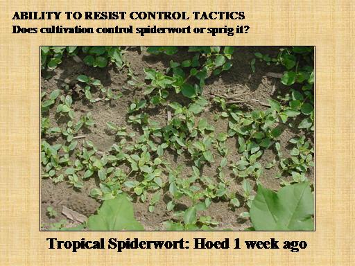 Tropical Spiderwort: Hoed 1 week ago<BR>ABILITY TO RESIST CONTROL TACTICS <BR>Does cultivation control spiderwort or sprig it?<BR>