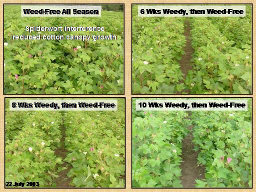 Weed-Free All Season<BR>6 Wks Weedy, then Weed-Free<BR>8 Wks Weedy, then Weed-Free<BR>10 Wks Weedy, then Weed-Free<BR>22 July 2003<BR>Spiderwort interference reduced cotton canopy growth<BR>