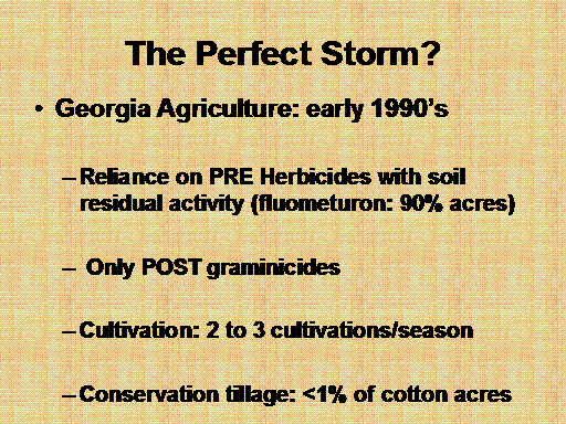 The Perfect Storm?<BR>Georgia Agriculture: early 1990’s <BR> <BR>Reliance on PRE Herbicides with soil residual activity (fluometuron: 90% acres) <BR> <BR> Only POST graminicides <BR> <BR>Cultivation: 2 to 3 cultivations/season <BR> <BR>Conservation tillage: <1% of cotton acres<BR>