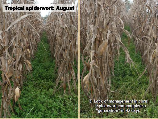 Tropical spiderwort: August<BR>3. Lack of management in corn; <BR>      Spiderwort can complete a  <BR>      “generation” in 42 days<BR>
