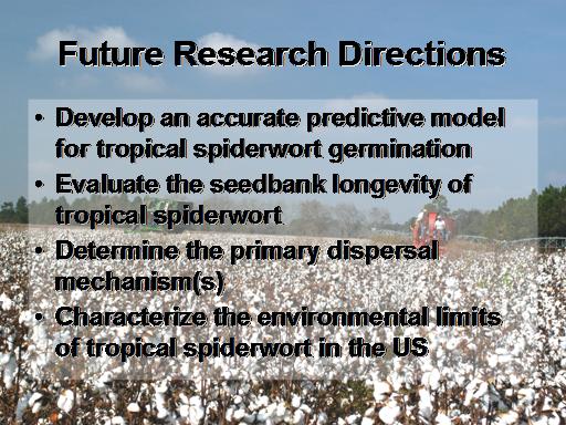 Future Research Directions<BR>Develop an accurate predictive model for tropical spiderwort germination <BR>Evaluate the seedbank longevity of tropical spiderwort <BR>Determine the primary dispersal mechanism(s) <BR>Characterize the environmental limits of tropical spiderwort in the US<BR>