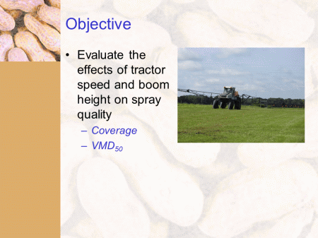 Objective<BR>Evaluate the effects of tractor speed and boom height on spray quality <BR>Coverage  <BR>VMD50<BR>