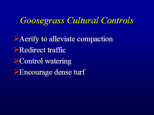 Goosegrass Cultural Controls<BR>Aerify to alleviate compaction  <BR>Redirect traffic <BR>Control watering <BR>Encourage dense turf<BR>