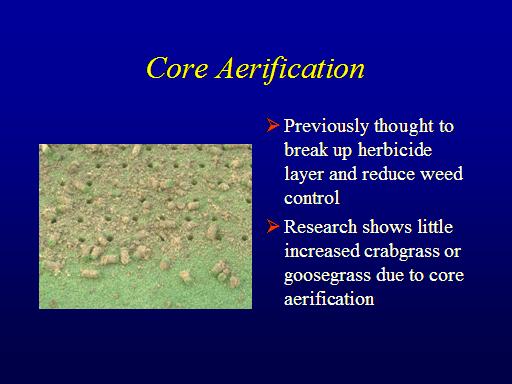 Core Aerification<BR>Previously thought to break up herbicide layer and reduce weed control <BR>Research shows little increased crabgrass or goosegrass due to core aerification<BR>