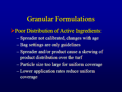 Granular Formulations<BR>Poor Distribution of Active Ingredients: <BR>Spreader not calibrated, changes with age  <BR>Bag settings are only guidelines <BR>Spreader and/or product cause a skewing of product distribution over the turf <BR>Particle size too large for uniform coverage <BR>Lower application rates reduce uniform coverage<BR>