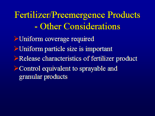Fertilizer/Preemergence Products - Other Considerations<BR>Uniform coverage required <BR>Uniform particle size is important <BR>Release characteristics of fertilizer product <BR>Control equivalent to sprayable and granular products<BR>