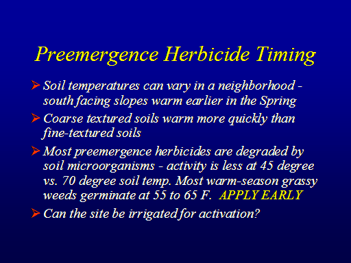 Preemergence Herbicide Timing<BR>Soil temperatures can vary in a neighborhood - south facing slopes warm earlier in the Spring <BR>Coarse textured soils warm more quickly than fine-textured soils <BR>Most preemergence herbicides are degraded by soil microorganisms - activity is less at 45 degree vs. 70 degree soil temp. Most warm-season grassy weeds germinate at 55 to 65 F.  APPLY EARLY <BR>Can the site be irrigated for activation?<BR>