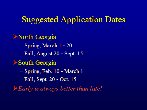 Suggested Application Dates<BR>North Georgia <BR>Spring, March 1 - 20 <BR>Fall, August 20 - Sept. 15 <BR>South Georgia <BR>Spring, Feb. 10 - March 1 <BR>Fall, Sept. 20 - Oct. 15 <BR>Early is always better than late! <BR>