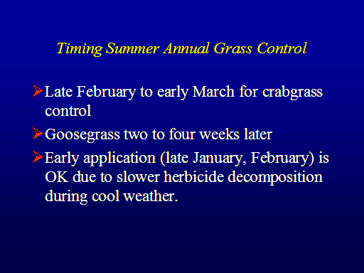 Timing Summer Annual Grass Control<BR>Late February to early March for crabgrass control <BR>Goosegrass two to four weeks later <BR>Early application (late January, February) is OK due to slower herbicide decomposition during cool weather.<BR>