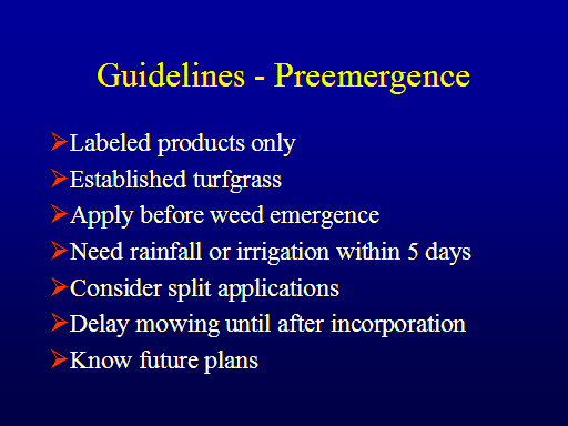 Guidelines - Preemergence<BR>Labeled products only <BR>Established turfgrass <BR>Apply before weed emergence <BR>Need rainfall or irrigation within 5 days <BR>Consider split applications <BR>Delay mowing until after incorporation <BR>Know future plans<BR>