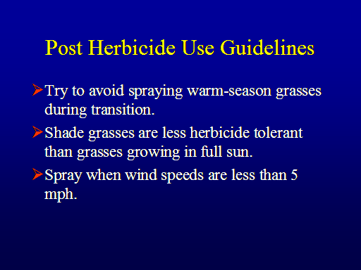 Post Herbicide Use Guidelines<BR>Try to avoid spraying warm-season grasses during transition. <BR>Shade grasses are less herbicide tolerant than grasses growing in full sun. <BR>Spray when wind speeds are less than 5 mph.<BR>