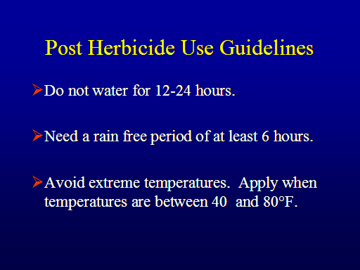 Post Herbicide Use Guidelines<BR>Do not water for 12-24 hours. <BR> <BR>Need a rain free period of at least 6 hours. <BR> <BR>Avoid extreme temperatures.  Apply when temperatures are between 40  and 80°F.<BR>
