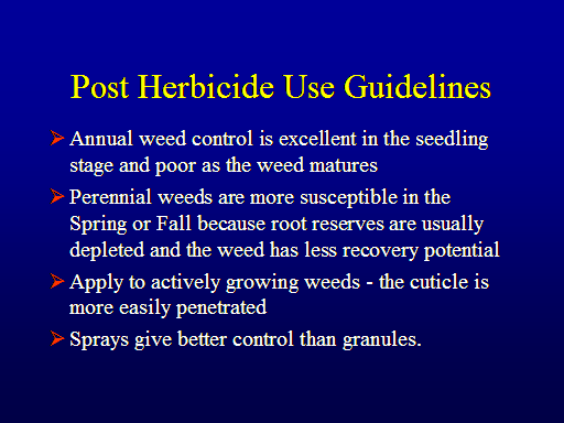 Post Herbicide Use Guidelines<BR>Annual weed control is excellent in the seedling stage and poor as the weed matures <BR>Perennial weeds are more susceptible in the Spring or Fall because root reserves are usually depleted and the weed has less recovery potential <BR>Apply to actively growing weeds - the cuticle is more easily penetrated <BR>Sprays give better control than granules.<BR>