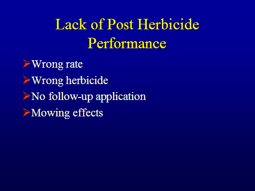 Lack of Post Herbicide Performance<BR>Wrong rate <BR>Wrong herbicide <BR>No follow-up application <BR>Mowing effects<BR>