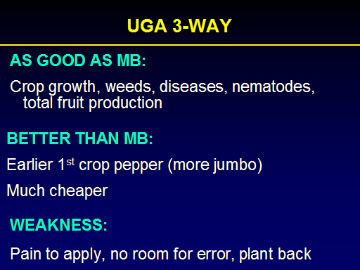 UGA 3-WAY<BR>AS GOOD AS MB: <BR>Crop growth, weeds, diseases, nematodes, total fruit production<BR>WEAKNESS: <BR>Pain to apply, no room for error, plant back <BR>BETTER THAN MB: <BR>Earlier 1st crop pepper (more jumbo) <BR>Much cheaper<BR>