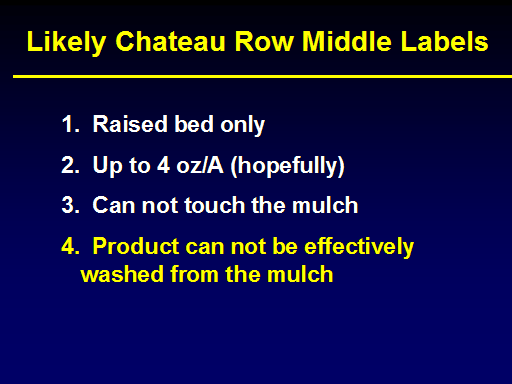 Raised bed only <BR>  Up to 4 oz/A (hopefully) <BR>  Can not touch the mulch <BR>  Product can not be effectively washed from the mulch <BR>Likely Chateau Row Middle Labels<BR>