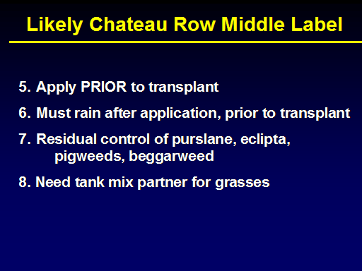 Likely Chateau Row Middle Label<BR>5.	 Apply PRIOR to transplant <BR> Must rain after application, prior to transplant <BR> Residual control of purslane, eclipta,  	pigweeds, beggarweed <BR>8. Need tank mix partner for grasses<BR>