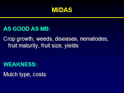 MIDAS<BR>AS GOOD AS MB: <BR>Crop growth, weeds, diseases, nematodes, fruit maturity, fruit size, yields<BR>WEAKNESS: <BR>Mulch type, costs<BR>