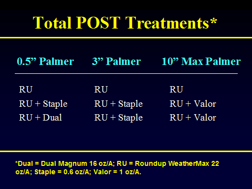 Total POST Treatments*<BR>RU				RU			RU <BR>RU + Staple		RU + Staple		RU + Valor <BR>RU + Dual		RU + Staple		RU + Valor<BR>  0.5” Palmer	  3” Palmer	10” Max Palmer<BR>*Dual = Dual Magnum 16 oz/A; RU = Roundup WeatherMax 22 oz/A; Staple = 0.6 oz/A; Valor = 1 oz/A.<BR>