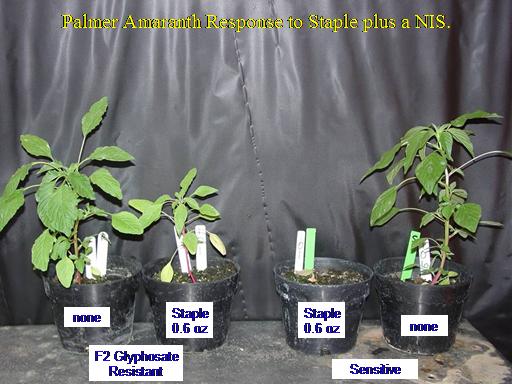 Palmer Amaranth Response to Staple plus a NIS.<BR>F2 Glyphosate Resistant<BR>none<BR>Staple 0.6 oz<BR>none<BR>Staple 0.6 oz<BR>Sensitive<BR>