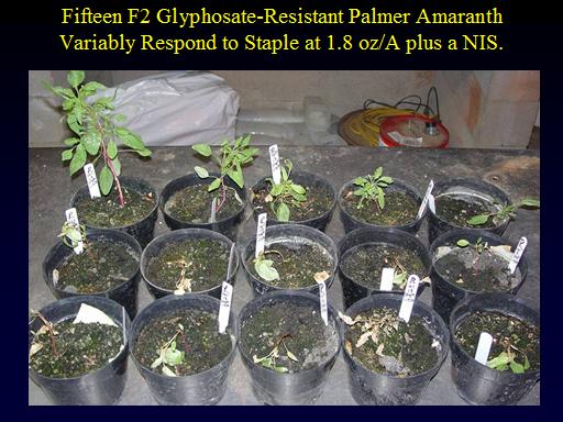 Fifteen F2 Glyphosate-Resistant Palmer Amaranth Variably Respond to Staple at 1.8 oz/A plus a NIS.<BR>