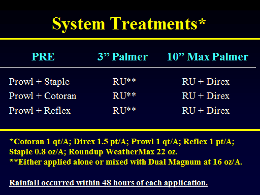 System Treatments*<BR>Prowl + Staple		RU**		       RU + Direx <BR>Prowl + Cotoran		RU**		       RU + Direx <BR>Prowl + Reflex		RU**		       RU + Direx<BR>       PRE	 	   3” Palmer   	10” Max Palmer<BR>*Cotoran 1 qt/A; Direx 1.5 pt/A; Prowl 1 qt/A; Reflex 1 pt/A; Staple 0.8 oz/A; Roundup WeatherMax 22 oz.   <BR>**Either applied alone or mixed with Dual Magnum at 16 oz/A. <BR> <BR>Rainfall occurred within 48 hours of each application.<BR>