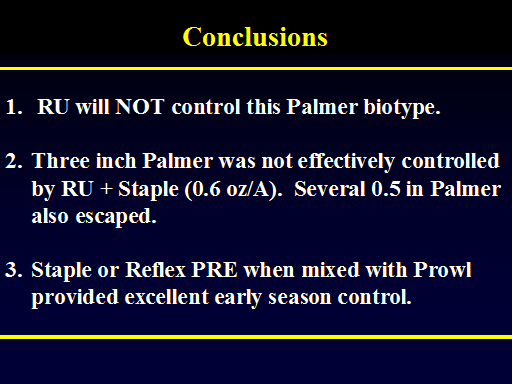 Conclusions<BR> RU will NOT control this Palmer biotype. <BR> <BR>Three inch Palmer was not effectively controlled by RU + Staple (0.6 oz/A).  Several 0.5 in Palmer also escaped. <BR> <BR>Staple or Reflex PRE when mixed with Prowl provided excellent early season control.<BR>
