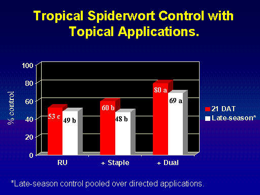 Tropical Spiderwort Control with Topical Applications. <BR>49 b<BR>48 b<BR>69 a<BR>% control<BR>53 c<BR>60 b<BR>80 a<BR>*Late-season control pooled over directed applications.<BR>