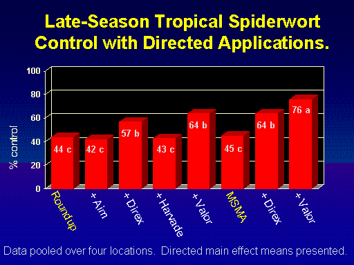 Late-Season Tropical Spiderwort Control with Directed Applications. <BR>44 c<BR>42 c<BR>80 a<BR>% control<BR>Roundup<BR>+ Aim<BR>+ Direx<BR>+ Harvade<BR>+ Valor<BR>MSMA<BR>+ Direx<BR>+ Valor<BR>Data pooled over four locations.  Directed main effect means presented.<BR>57 b<BR>43 c<BR>64 b<BR>45 c<BR>64 b<BR>76 a<BR>