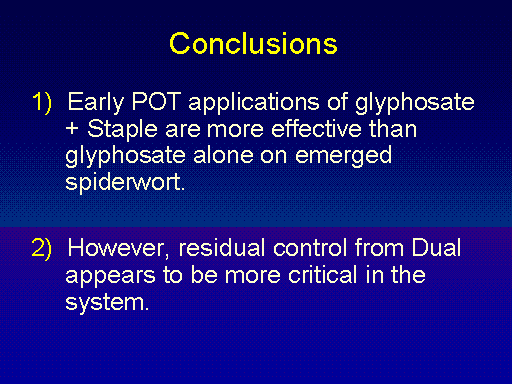 Conclusions<BR>1)  Early POT applications of glyphosate + Staple are more effective than glyphosate alone on emerged spiderwort.