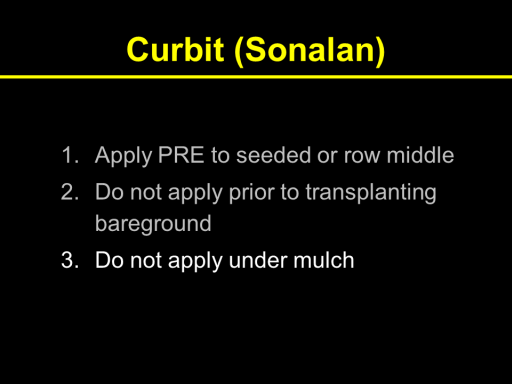 Curbit (Sonalan)<BR>Apply PRE to seeded or row middle <BR>Do not apply prior to transplanting bareground <BR>Do not apply under mulch<BR>
