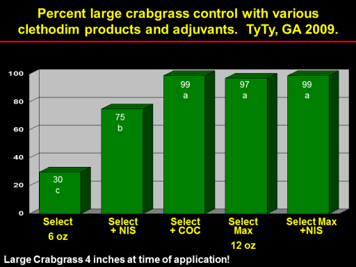 Percent large crabgrass control with various clethodim products and adjuvants.  TyTy, GA 2009.<BR>75 b<BR>30 c<BR>99 a<BR>Select Max <BR>12 oz<BR>Select <BR>6 oz<BR>Select Max     +NIS<BR>Select + NIS<BR>Select + COC<BR>97 a<BR>99 a<BR>Large Crabgrass 4 inches at time of application!<BR>