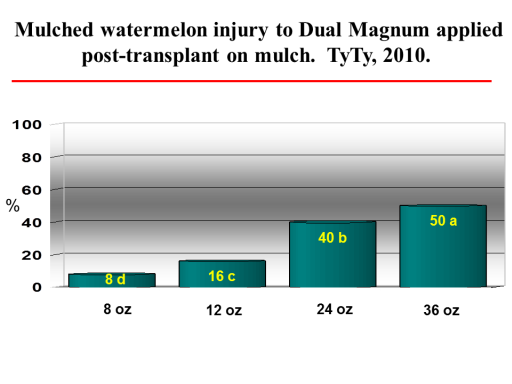 Mulched watermelon injury to Dual Magnum applied post-transplant on mulch.  TyTy, 2010.<BR>8 d<BR>16 c<BR>40 b<BR>8 oz<BR>12 oz<BR>50 a<BR>24 oz<BR>36 oz<BR>%<BR>