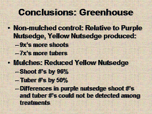 Conclusions: Greenhouse<BR>Non-mulched control: Relative to Purple Nutsedge, Yellow Nutsedge produced: <BR>9x’s more shoots  <BR>7x’s more tubers  <BR>Mulches: Reduced Yellow Nutsedge  <BR>Shoot #’s by 96% <BR>Tuber #’s by 50% <BR>Differences in purple nutsedge shoot #’s and tuber #’s could not be detected among treatments<BR>
