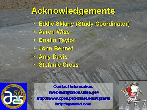 Acknowledgements <BR>Contact Information: <BR>Twebster@tifton.usda.gov <BR>http://www.cpes.peachnet.edu/cpmru/ <BR>http://gaweed.com<BR>Eddie Sklany (Study Coordinator) <BR>Aaron Wise <BR>Dustin Taylor <BR>John Bennet <BR>Amy Davis <BR>Stefanie Cross<BR>