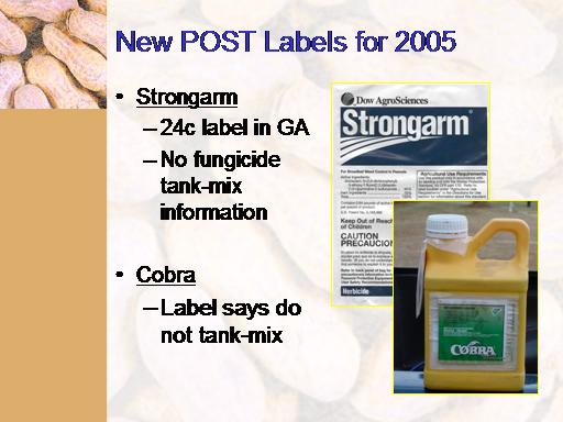 New POST Labels for 2005<BR>Strongarm <BR>24c label in GA <BR>No fungicide tank-mix information <BR> <BR>Cobra <BR>Label says do not tank-mix<BR>