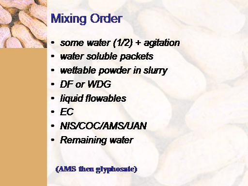 Mixing Order<BR>some water (1/2) + agitation <BR>water soluble packets <BR>wettable powder in slurry <BR>DF or WDG <BR>liquid flowables <BR>EC <BR>NIS/COC/AMS/UAN <BR>Remaining water <BR>(AMS then glyphosate)<BR>