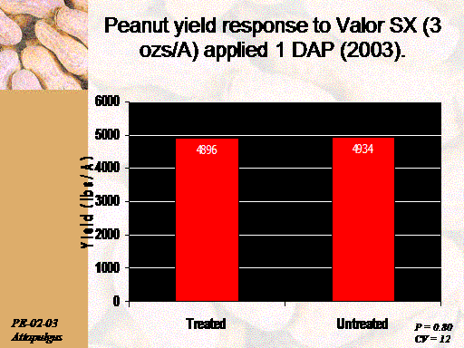 Peanut yield response to Valor SX (3 ozs/A) applied 1 DAP (2003).<BR>PE-02-03