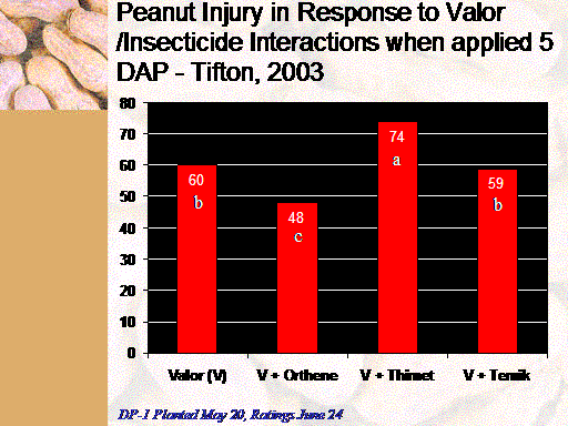 Peanut Injury in Response to Valor /Insecticide Interactions when applied 5 DAP - Tifton, 2003<BR>DP-1 Planted May 20, Ratings June 24 <BR>b<BR>c<BR>a<BR>b<BR>
