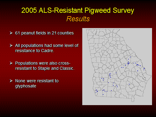 2005 ALS-Resistant Pigweed Survey Results<BR>61 peanut fields in 21 counties <BR> <BR>All populations had some level of resistance to Cadre. <BR> <BR>Populations were also cross-resistant to Staple and Classic.  <BR> <BR>None were resistant to glyphosate <BR>