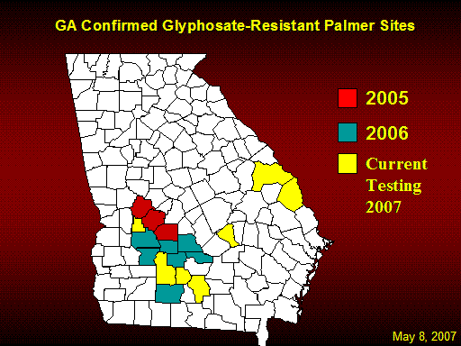 GA Confirmed Glyphosate-Resistant Palmer Sites<BR>2005<BR>2006<BR>May 8, 2007<BR>Current  <BR>Testing <BR>2007<BR>